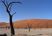 Sossusvlei is generally regarded as one of the most spectacular landscapes in Namibia. The ‘vlei’ (only after a heavy rainfall, which is a rare event in this area, does the vlei fill with water) is situated at the point where the Tsauchab River dams up at the foot of a spectacular series of sand dunes, its route to the sea blocked. The spectacular ‘mountains of sand’, at a height of around 300 metres, are said to be some of the highest in the world and have developed over a period of many millions of years. It is thought that the vast quantities of sand were deposited over time into the Atlantic Ocean by the Orange River. This material was subsequently moved northwards by the Benguela current to be dumped back onto the land by the surf. Wind then pushed the sand upwards initially into coastal dunes, which over time were shifted further and further inland. Located about 50km inland from the Atlantic Ocean, Sossusvlei and the neighbouring Deadvlei and Hidden Vlei lie at an altitude of between 550 and 560 metres above sea level, with the dunes around the vlei rising 80 to 110 metres above this. The highest dune in the area is thought to be Dune 7 (apparently the seventh dune after crossing the Tsauchab River, and not to be confused with the famous Dune 7 near Walvis Bay) at approximately 380 metres.